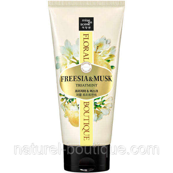 Mise en scène Парфумована маска для волосся Floral boutique фрезія та мускус поживний тритмент для волосся з витонченим ароматом фрезії та мускусу, який відновлює, пом'якшує і зміцнює волосся, надаючи йому гладкість, блиск і доглянутий вигляд.
